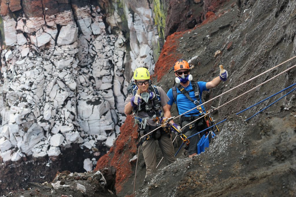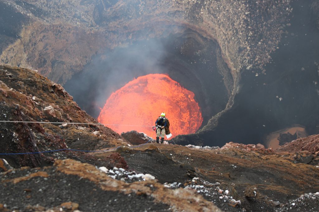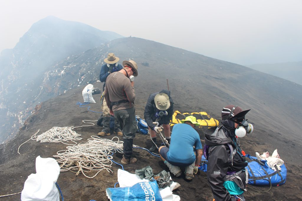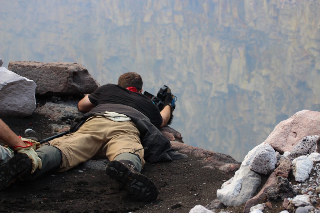 The next day, the Japanese film crew wanted to capture Geoff descending to a 100 meter ledge that provided incredible footage – and provide the illusion that lava lake was much closer than reality. The setup took considerable time and planning. Normally, rope would be attached to an anchor for the rappel. Unfortunately, being up on a volcano, there was nothing suitable for an anchor so we used a large anchor bag filled with sand and rocks. Petrol-driven ascenders made for an easy climb out. The footage being captured was epic.