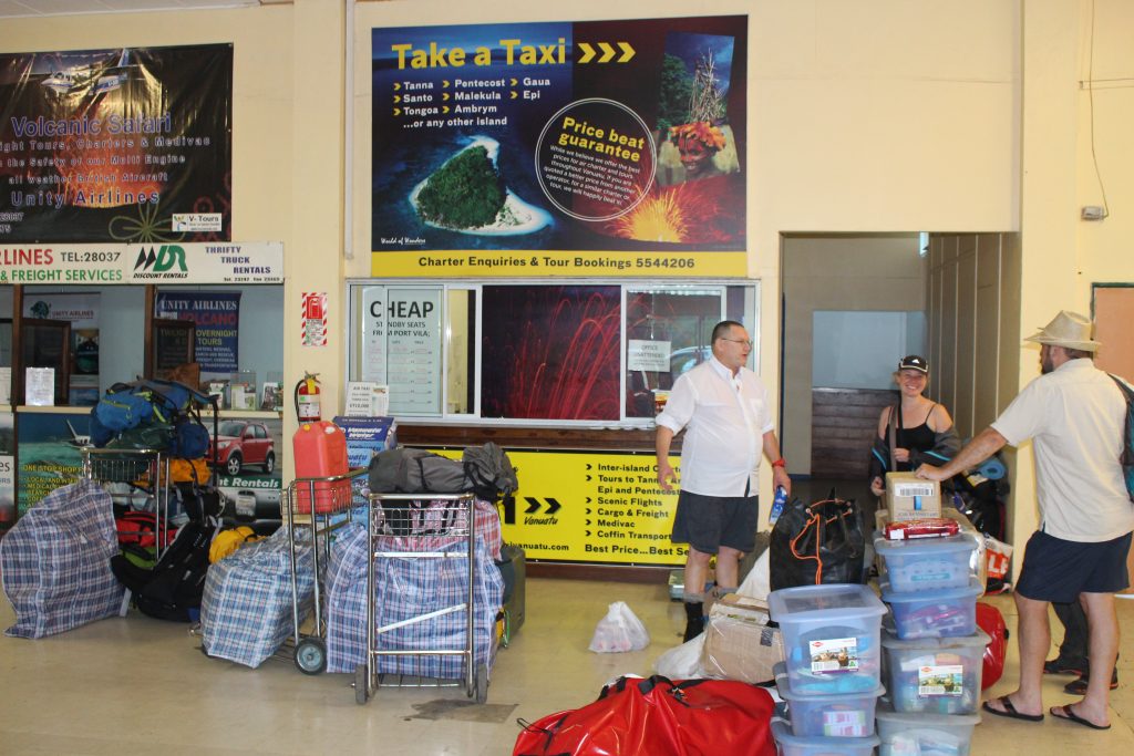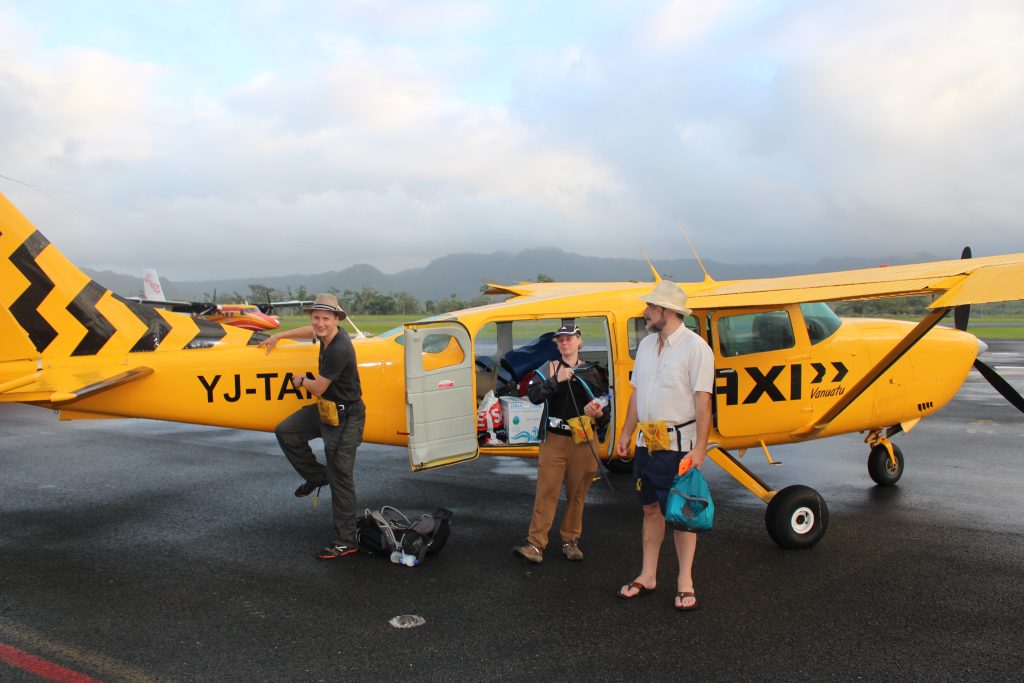 On Thursday (November 26) we were up at 4am, ready for a 5am departure from The Melanesian. We loaded what seemed an endless number of backpacks, plastic containers and duffle bags onto the back of Geoff’s pickup truck and headed for the domestic terminal. We met the Japanese crew from NHK and began the check-in process. Air Taxi Vanuatu had organised two aircraft and a helicopter from Vanuatu Helicopters. Geoff and Brad would take the helicopter, the NHK crew the Britten Norman Islander and we’d be on a Cessna.