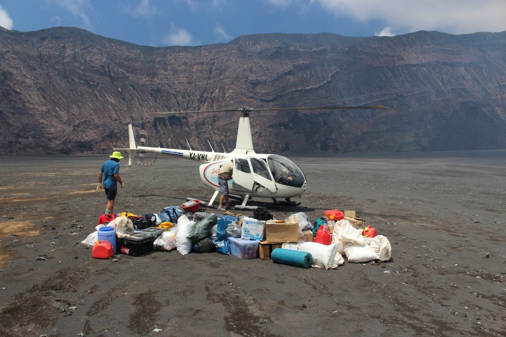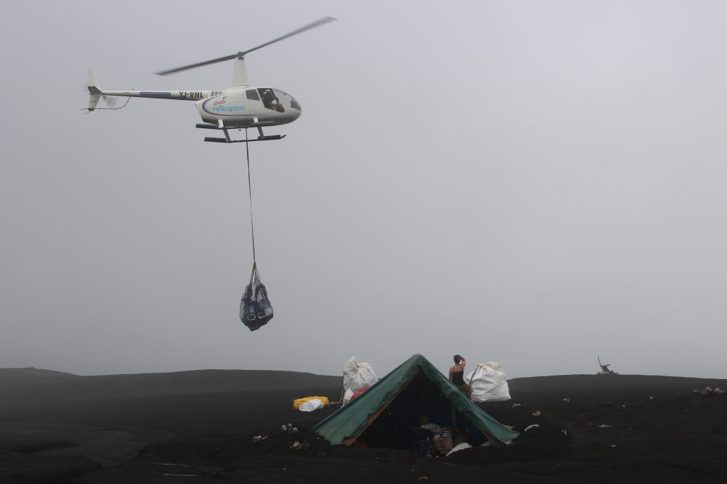 After spending four nights on Marum, we packed down our tents and gear and the helicopter returned once more, transferring us to Benbow. Unlike Marum, Benbow featured a large flat area within the crater that was going to be our campsite for the next few days. We had visited this location on our previous expedition. It was difficult flying for the pilot who had to circle a number of times to get the helicopter down.