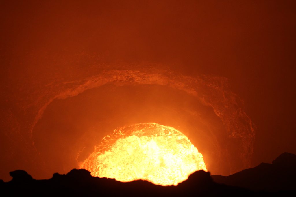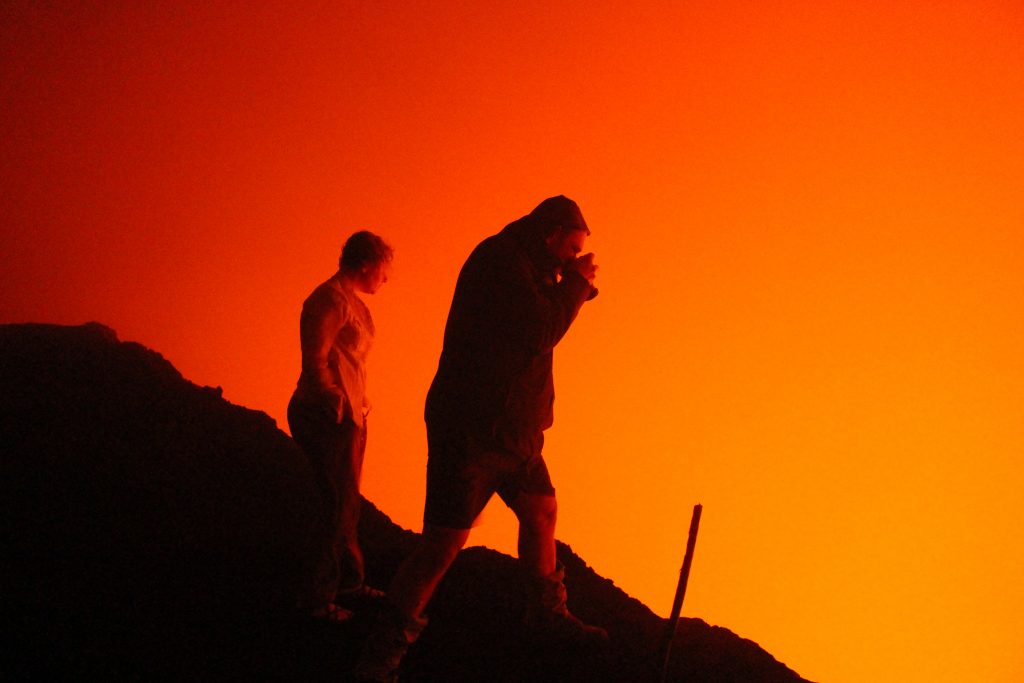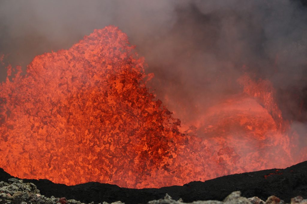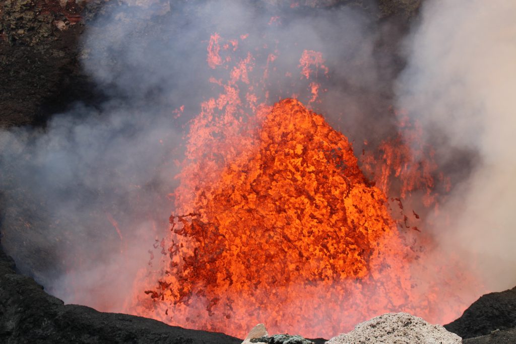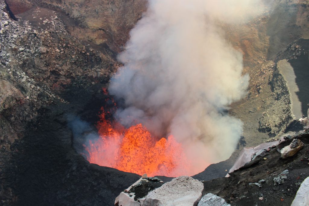 Over an hour later, we finally touched down on the crater floor. I looked up to see where we had come from. It looked such a long way back up. Rocks and boulders were littered everywhere and we knew they were a constant threat. The entire area was constantly shaking and like being in a constant earthquake. And in the middle of this vast crater was what we had come – the lava lake. From up top, it was hard to gauge the size, but all the way down there, it was easily the size of a football field. We walked over as close as we could before the heat became too intense. In front of us was a sight to behold. Lava surging fifty meters or higher. At times, I had to just leave the camera rolling and run as it got too hot to handle. At times it was relatively calm, then would fire back into life with some enormous pulses. At one point, I noticed a large number of relatively fresh lava fragments around us – this was a good reminder of the dangers that a large pulse could bring.