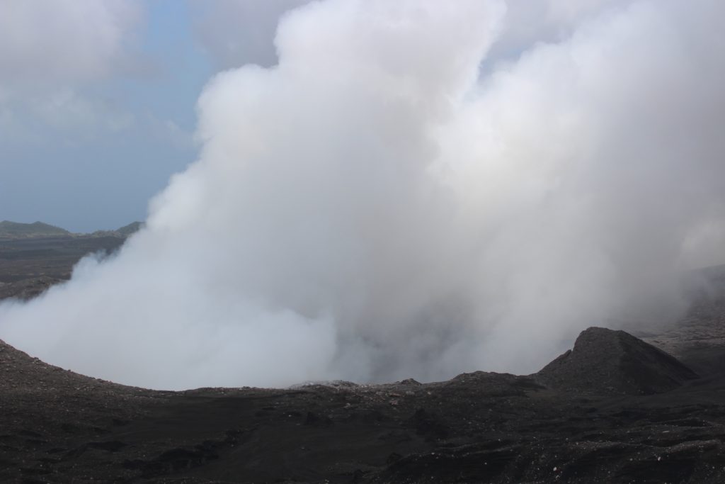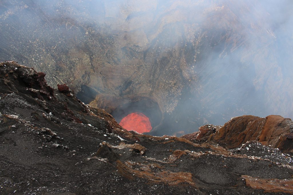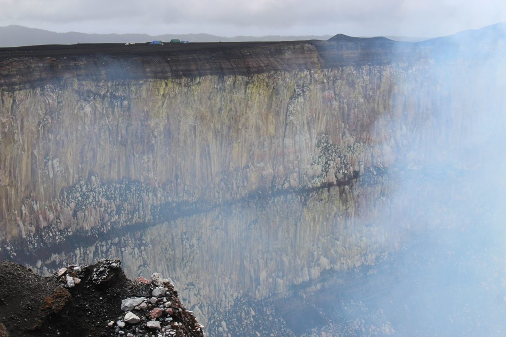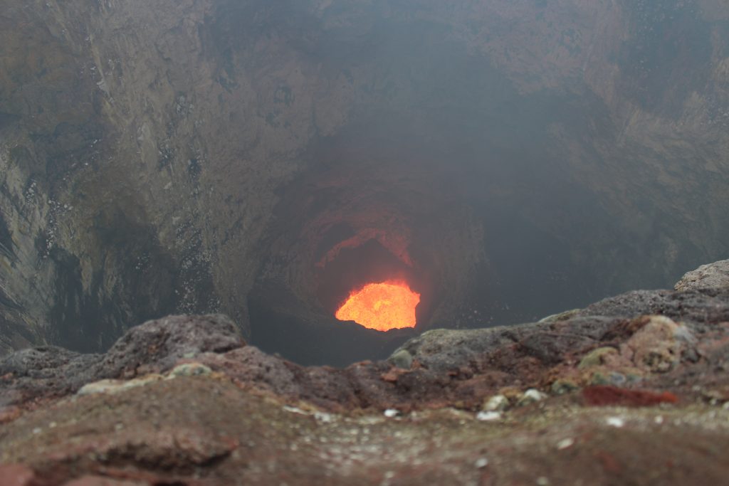 Before making our descent, we got word of another lava lake within the Benbow crater. After a short conversation and a rough idea of where it was, we started trekking alongside the inner crater wall. It was perilous and a slip could have been fatal. After 45 minutes, we located the crater. It was different from the lava lake at Benbow in that the crater was narrow and was difficult to view. Due to its funnel shape, it created a very dangerous upwards draft of toxic gases.