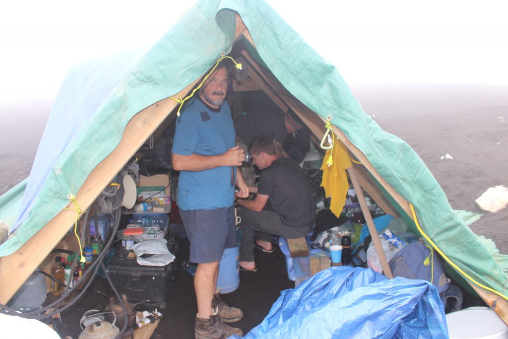 The A frame structure that Geoff and Brad had constructed was our communal area where we cooked, ate and passed the hours. A separate tent was our bathroom and toilet. The massive crater was 100 meters in front of us.