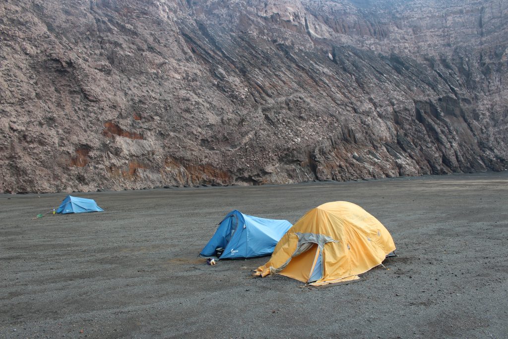We pitched our tents and quickly found the need to wear gloves. Pele’s hair, sharp hair-like strands made of glass were a painful reminder we weren’t on a regular camping trip. Nor could we hammer our tent pegs in the loose lapilli and ash. A good solution was to tie our guy ropes to rocks, then bury them. We also had to dig channels to avoid flooding.