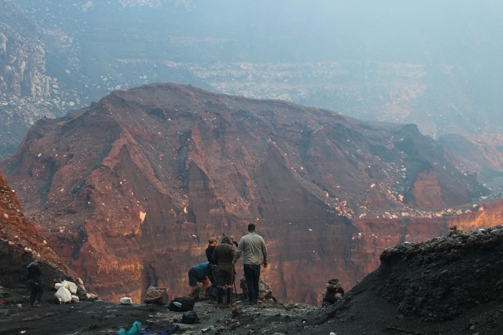 Descending into this crater would just about be suicidal. Instead, we came up with a plan to capture the lava lake without putting anyone in danger. I had about 100 meters of steel wire with me and a go pro and with the use of George’s tripod, we dropped the go pro over the edge and lowered it in. It worked a treat, but eventually ran out of wire and we were nowhere near the lava lake. Even 100 meters down, the Go Pro casing had begun to melt. The footage was interesting and gave us some great shots of the lava lake. We were the first people ever to capture it on film.