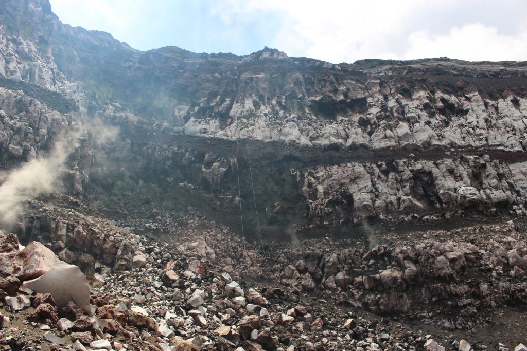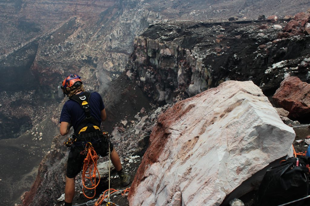 There were two sections of our descent. The first down a vertical cliff face. I slowly released the rope through the rack, carefully managing the speed of my descent, then pulling the safety rope through the ASAP. Hot fumaroles dotted the crater wall and rocks tumbled beneath my feet. Half an hour later, I was at the half way point – a small shelf and a welcome relief. Chris rigged up the next section, tying the rope around a large boulder and hoping this was anchored securely. The second section was a bit shorter, but equally as perilous as the cliff face was very unstable and easy to dislodge rocks.