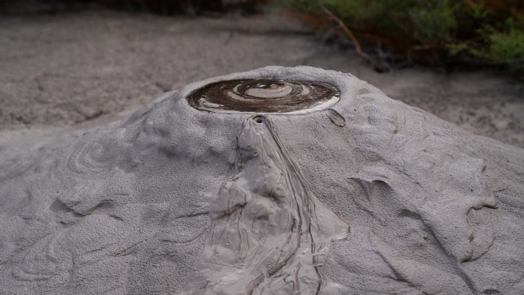 This is a conical mud volcano of fine-grained, grey sediment that rises within a mud pool. The top features a dark, circular opening, full of hot mud and sulphur deposits. A small opening has developed near the summit, creating a trail of flowing mud down the side of the cone. This mud volcano is formed by the eruption of mud and gases from underground reservoirs. The process involves pressurised water, heated by geothermal activity, mixing with fine-grained sediments to create a slurry. This slurry is then forced upwards through fissures and vents, building the cone-like structures as it accumulates and solidifies.