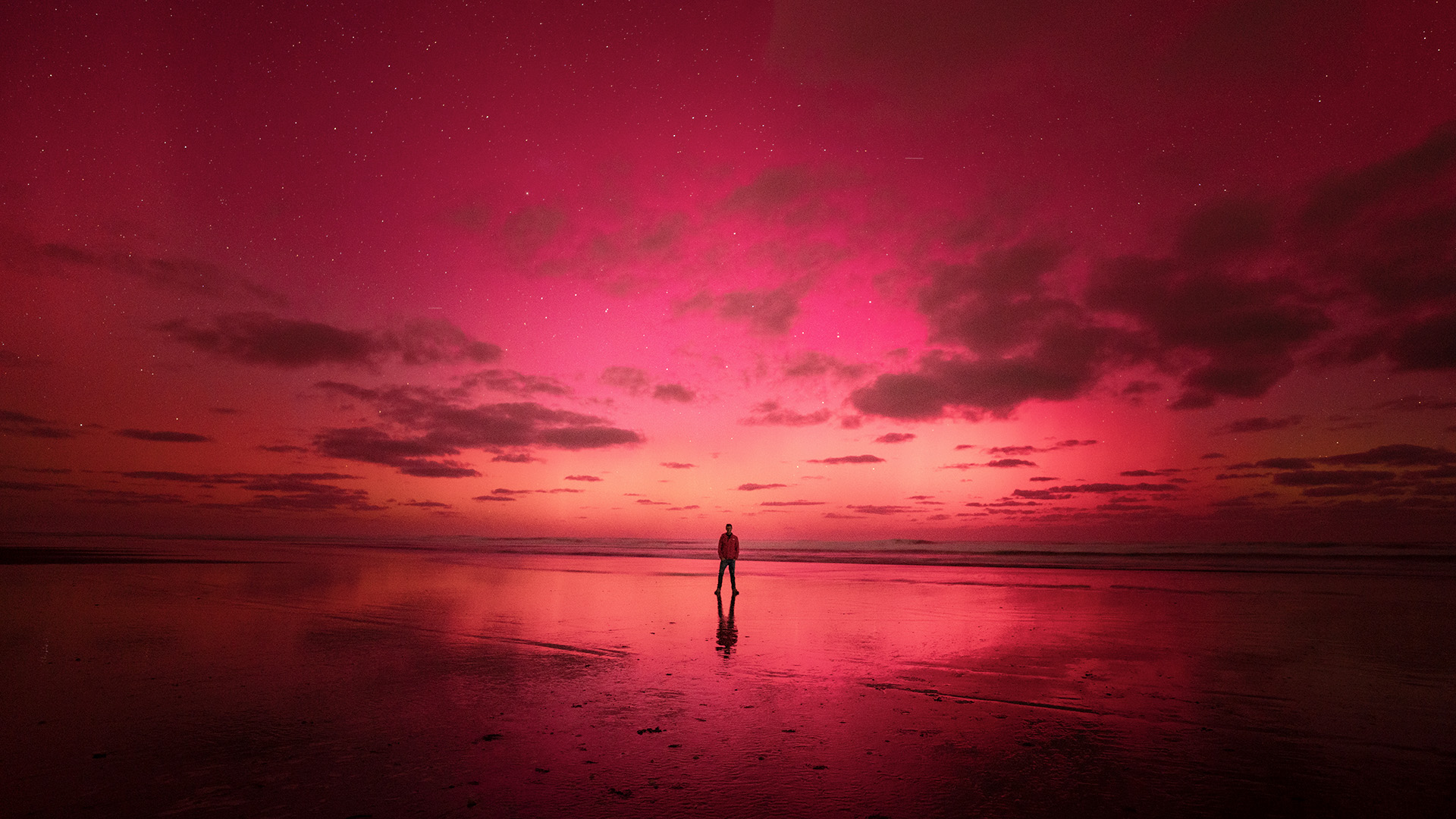 I continued snapping photos, capturing the initial stunning pink beams that transformed into red, yellow, green, and other hues. Normally, I have to crank up the ISO to capture anything in Auckland, but that night, I had to turn it down as the images were too bright. The wet sand mirrored the colors, creating an amazing reflection. I was alone, but the sheer awe of the moment had me screaming in disbelief.
