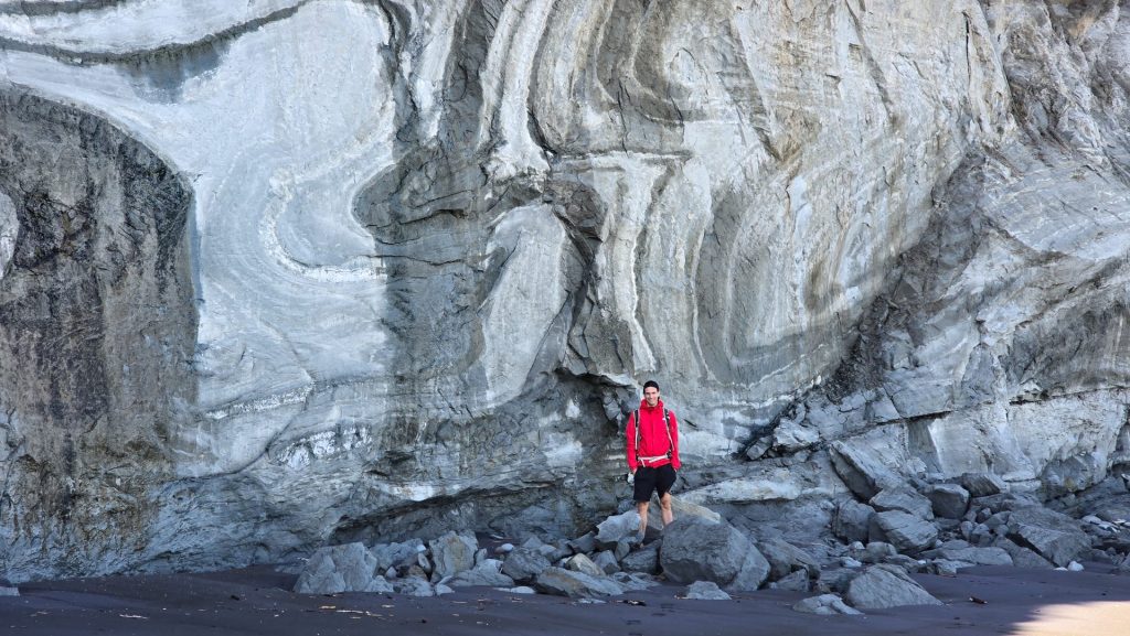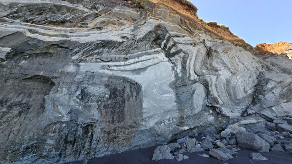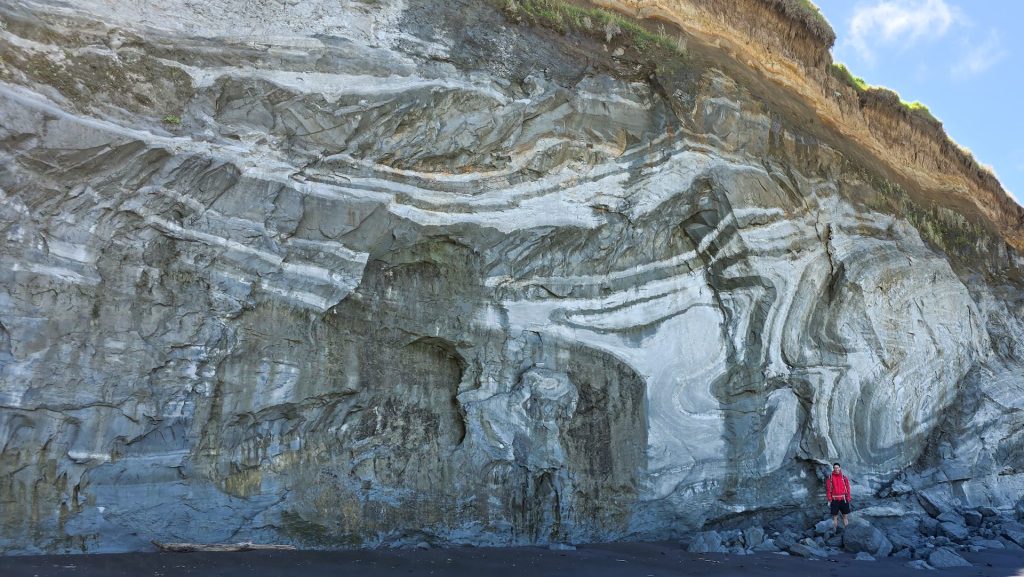 The dramatic folds visible in the cliff face in Taranaki are a spectacular example of soft-sediment deformation, likely formed within marine sedimentary rocks dating back to the Late Miocene epoch (roughly 11 to 5 million years ago). These layers, originally deposited horizontally or near-horizontally on the seabed as alternating beds of sand (lighter layers) and mud/silt (darker layers), were still unconsolidated and water-saturated when they became unstable. This instability likely triggered a submarine slump or slide, where a large mass of sediment moved downslope under gravity, perhaps initiated by an earthquake or rapid sediment loading. During this slumping process, the soft, pliable layers were intensely folded, contorted, and mixed together, creating the complex swirling patterns observed. Subsequently, these deformed sediments were buried by younger deposits, compacted, hardened into rock and eventually uplifted and exposed by coastal erosion.
